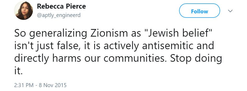 On November 8, 2015, Pierce tweeted: “So generalizing Zionism as ‘Jewish belief’ isn't just false, it is actively antisemitic and directly harms our communities. Stop doing it.”