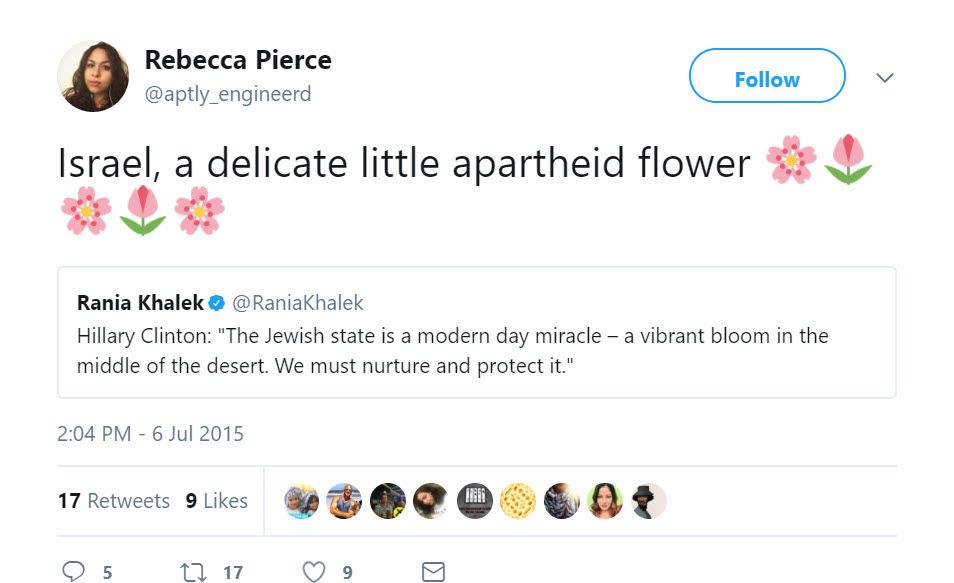 On April 1, 2017, Pierce tweeted: “Rachel Gilmer says that including Jews of Color in our analysis of Zionism further exposes its white supremacist roots #JVP2017 #JOCSM4Pal.”