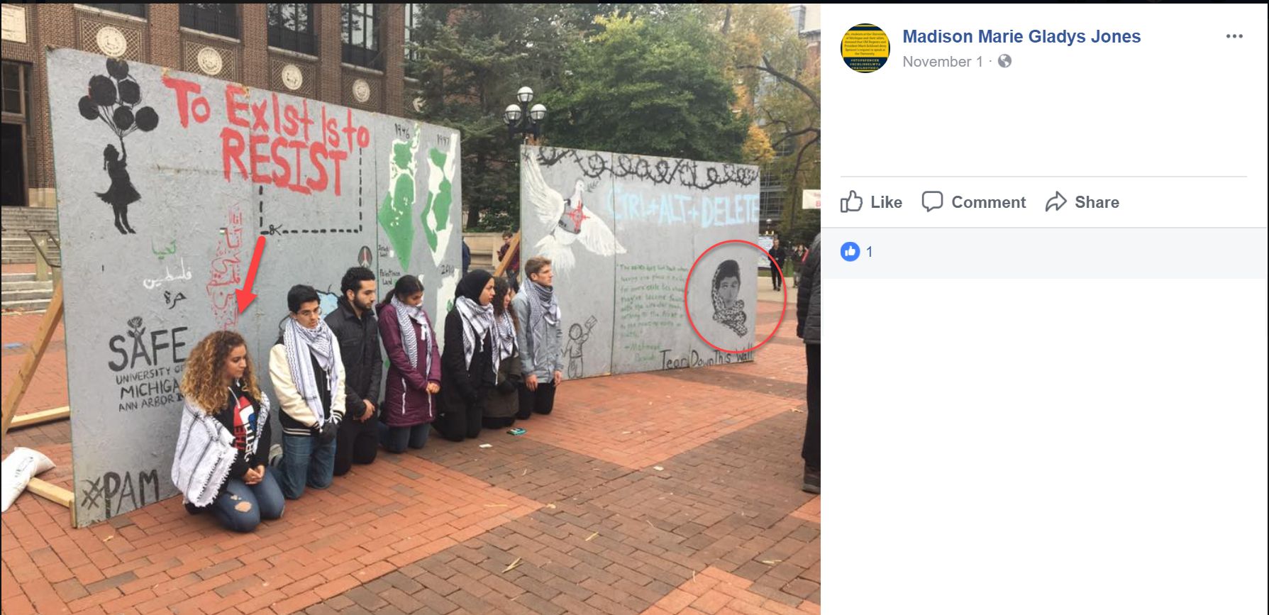On November 1, 2017, SAFE posted a photo on Facebook of a mock Israeli security barrier alongside an image of terrorist Leila Khaled. SAFE wrote: “We’re back. #UMDivest.”