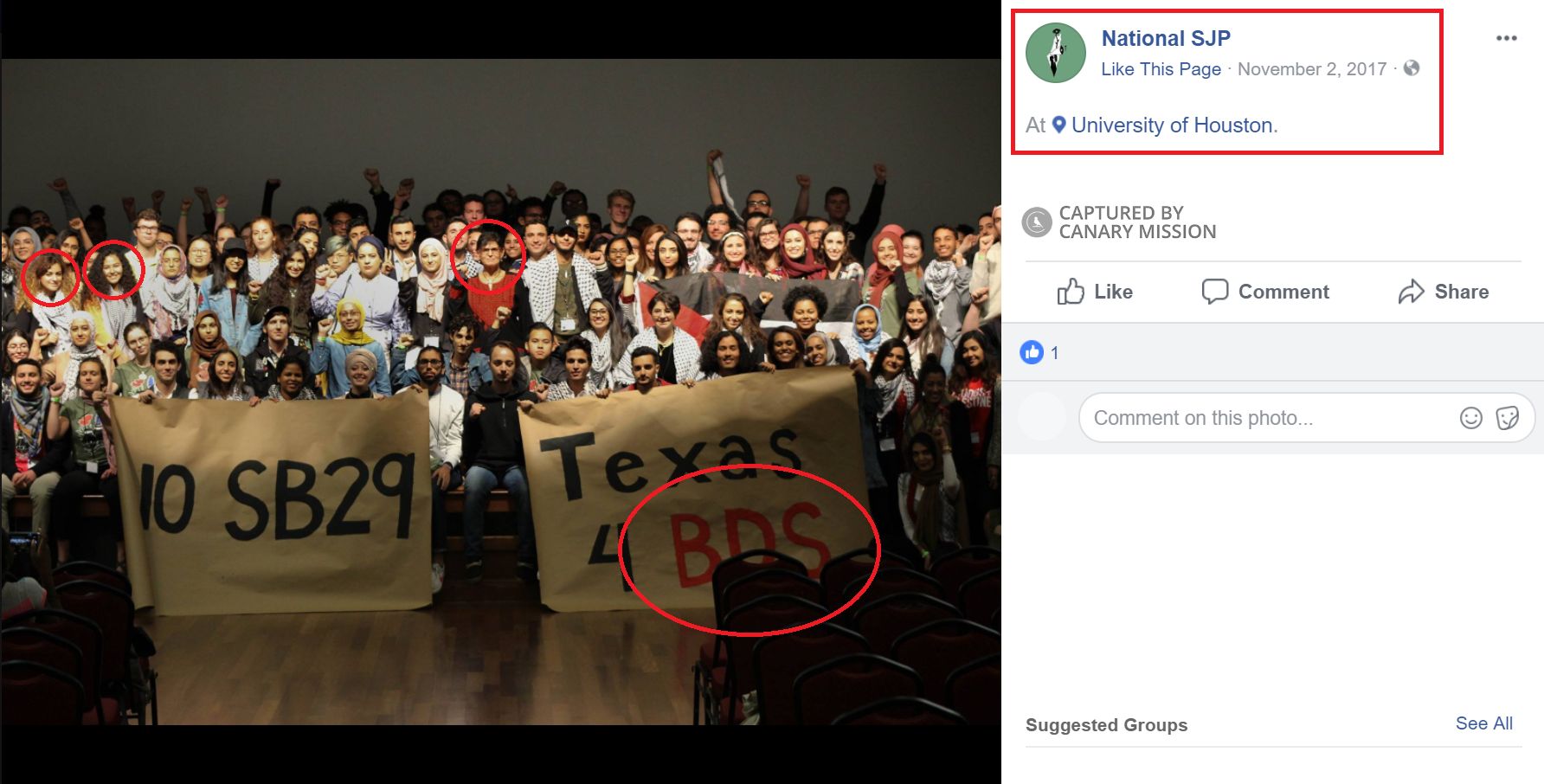 However, SAFE activists Arwa Gayar and Reem Al-Khatib, who spoke [1:40:42] at both [00:38:19] CSG hearings, posed for a photo supporting BDS at the 2017 National SJP Conference (NSJP 2017) in Texas from October 27-29.