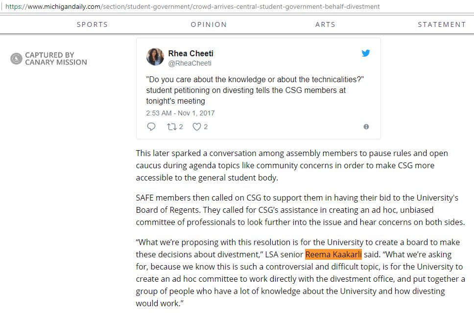 On November 14, 2017, Kaakarli spoke before the UM Central Student Government (CSG) in support of #UMDivest where she attempted [00:53:32] to distance UMDivest’s resolution from BDS.Kaakarli specified [00:54:28]: “We really want to distinguish ourselves from the leaders of the broader BDS movement … Just because we’re saying that ‘we’re divest,’ doesn’t mean that we’re intrinsically linked to the BDS movement.”