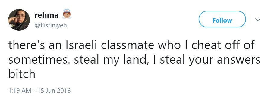 On June 15, 2016, Mohamed tweeted: “there's an Israeli classmate who I cheat off of sometimes. steal my land, I steal your answers b**ch.”