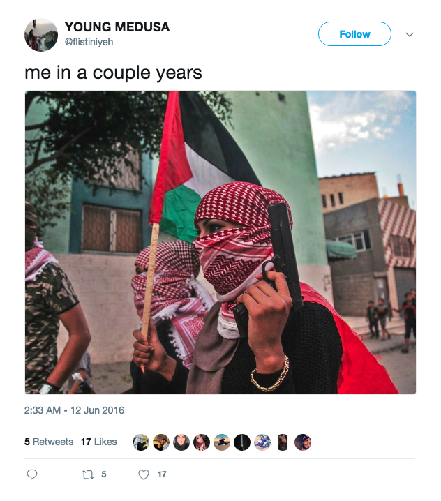 On June 12, 2016, Mohamed tweeted a photo of a masked woman holding a pistol and a Palestinian flag, with the caption: “me in a couple years.”On June 18, 2016, Mohamed posted a picture on Instagram of 2 portraits, with the caption: “Mahmoud Darwish and Ghassan Kanafani, Palestinian writers and heroes....Kanafani, aside from being a writer, was a member of the PFLP and was assassinated by the Mossad.”