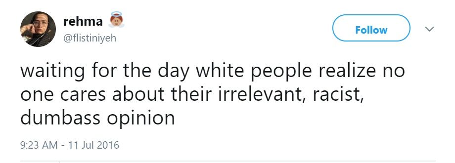 On July 11, 2016, Mohamed tweeted: “waiting for the day white people realize no one cares about their irrelevant, racist, dumbass opinion.”