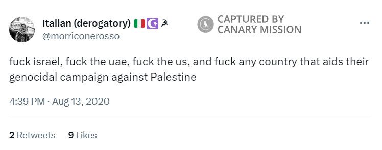 On August 13, 2020, Brindisi tweeted: “f**k israel, f**k the uae [United Arab Emirates], f**k the us, and f**k any country that aids their [Israel’s] genocidal campaign against Palestine.”