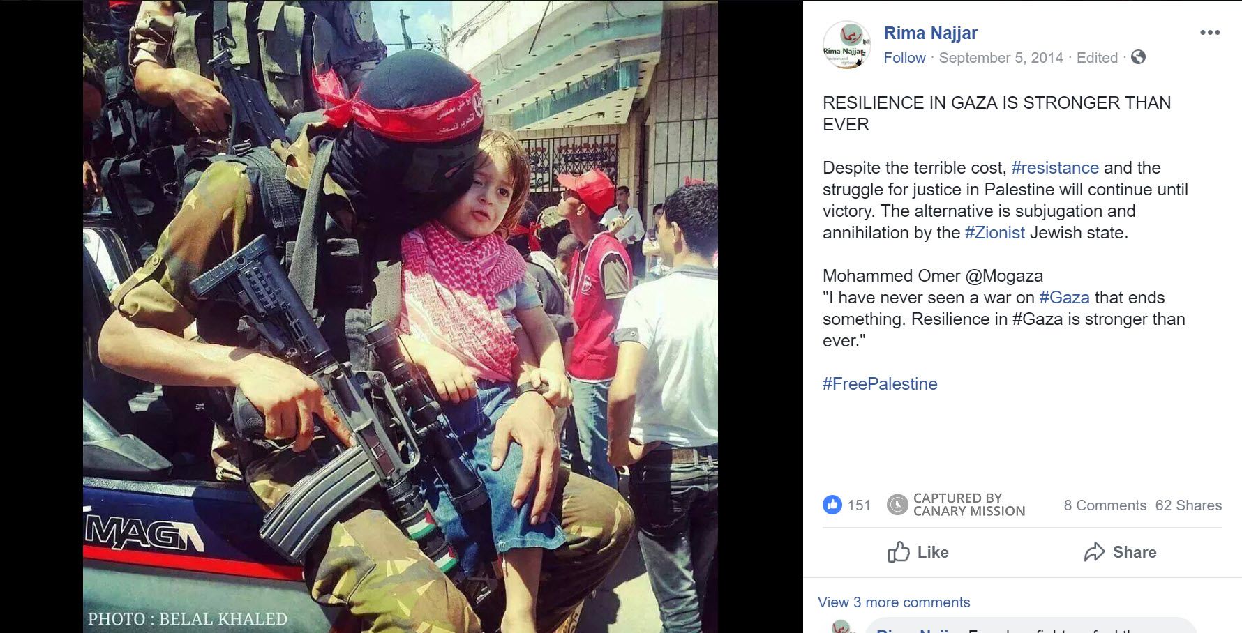 On September 5, 2014, Najjar posted to Facebook a photo of a masked PFLP militant cradling an assault weapon with a sniper scope in one arm and a child in the other, commenting: “RESILIENCE IN GAZA IS STRONGER THAN EVER Despite the terrible cost, #resistance and the struggle for justice in Palestine will continue until victory.”