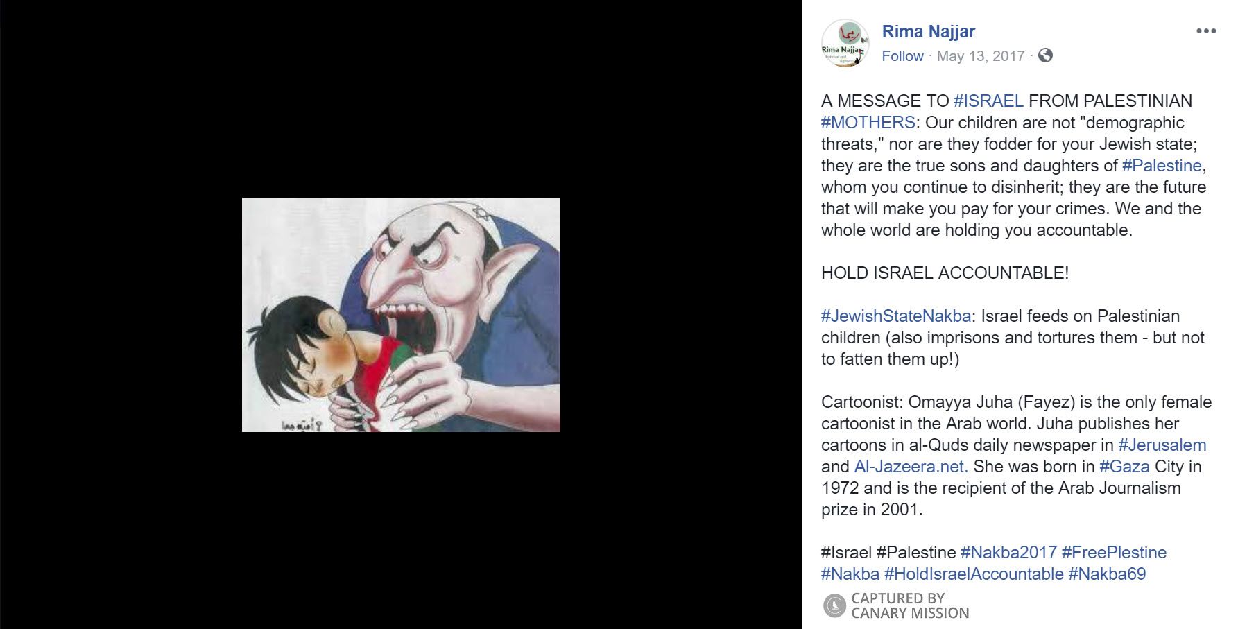 On May 13, 2017, Najjar posted to Facebook a graphic of a Jewish vampire about to sink his teeth into a Palestinian child. Najjar added: “#JewishStateNakba: Israel feeds on Palestinian children (also imprisons and tortures them - but not to fatten them up!)”