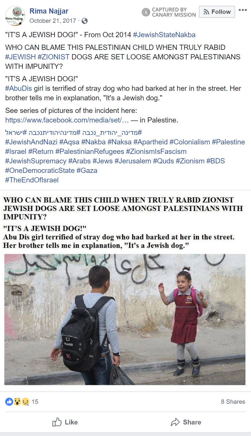 On October 21, 2017, Najjar posted to Facebook: “WHO CAN BLAME THIS PALESTINIAN CHILD WHEN TRULY RABID #JEWISH #ZIONIST DOGS ARE SET LOOSE AMONGST PALESTINIANS WITH IMPUNITY?”