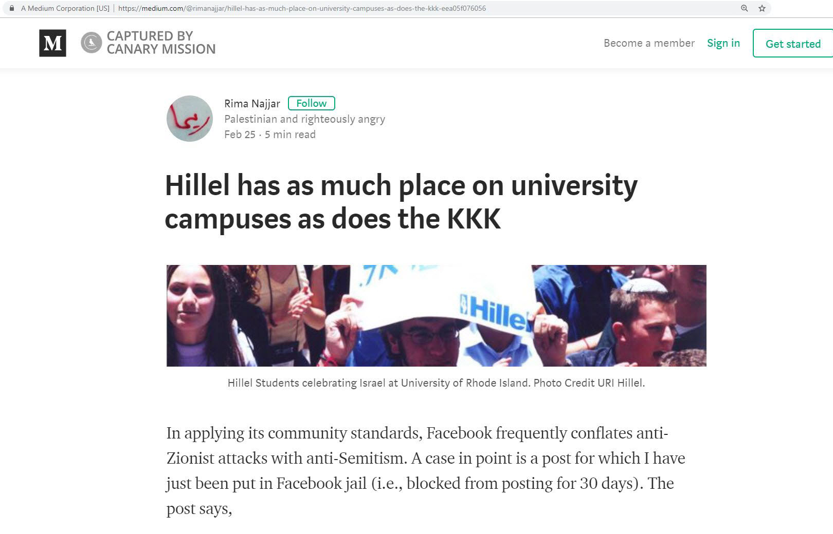 On February 25, 2018, Najjar posted to her Medium account a Facebook post she authored that demonized the Hillel Jewish student association on campus, writing: ““#Hillel, a racist organization, has as much place on university campuses as does the #KKK.”