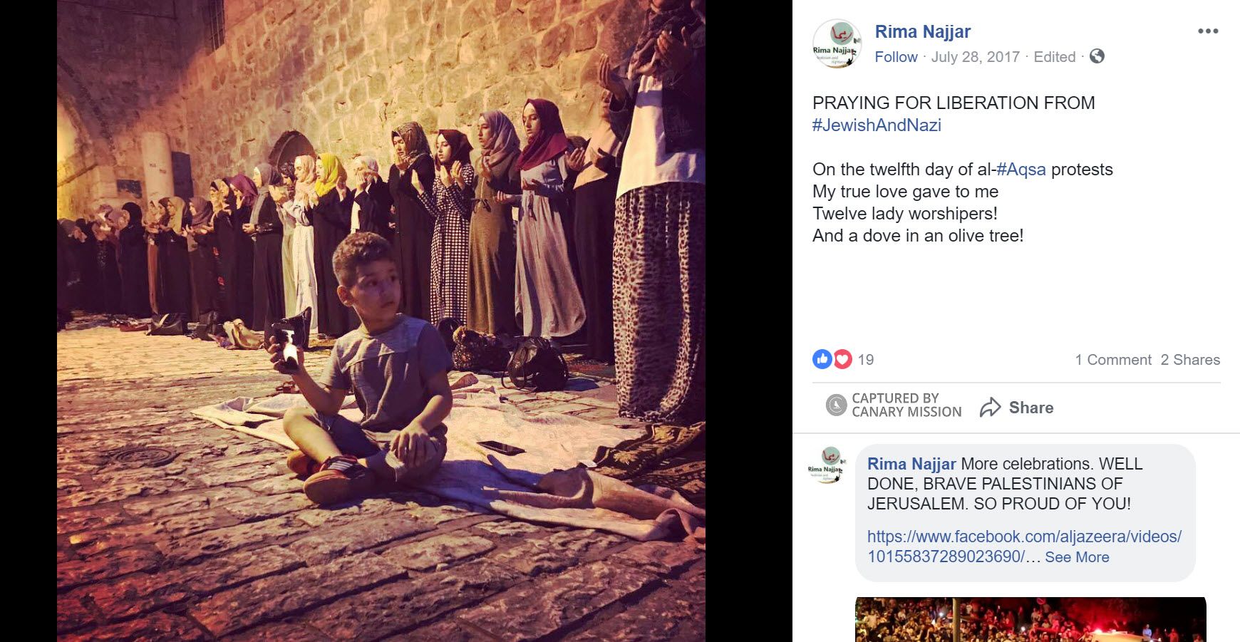 On June 17, 2017, Najjar posted to Facebook: “While resisting the Jewish colonization of Palestine,THREE PALESTINIANS CARRY OUT KNIFE-AND-GUN ATTACK IN ILLEGALLY ANNEXED#JERUSALEM, POLICEWOMAN KILLED.”