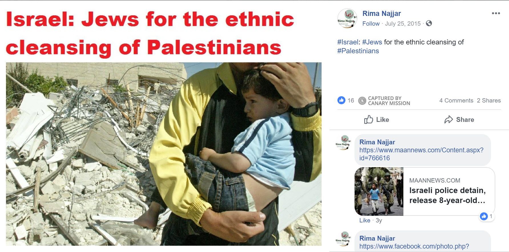 On July 25, 2015, Najjar posted to Facebook: “#Israel: #Jews for the ethnic cleansing of#Palestinians.”