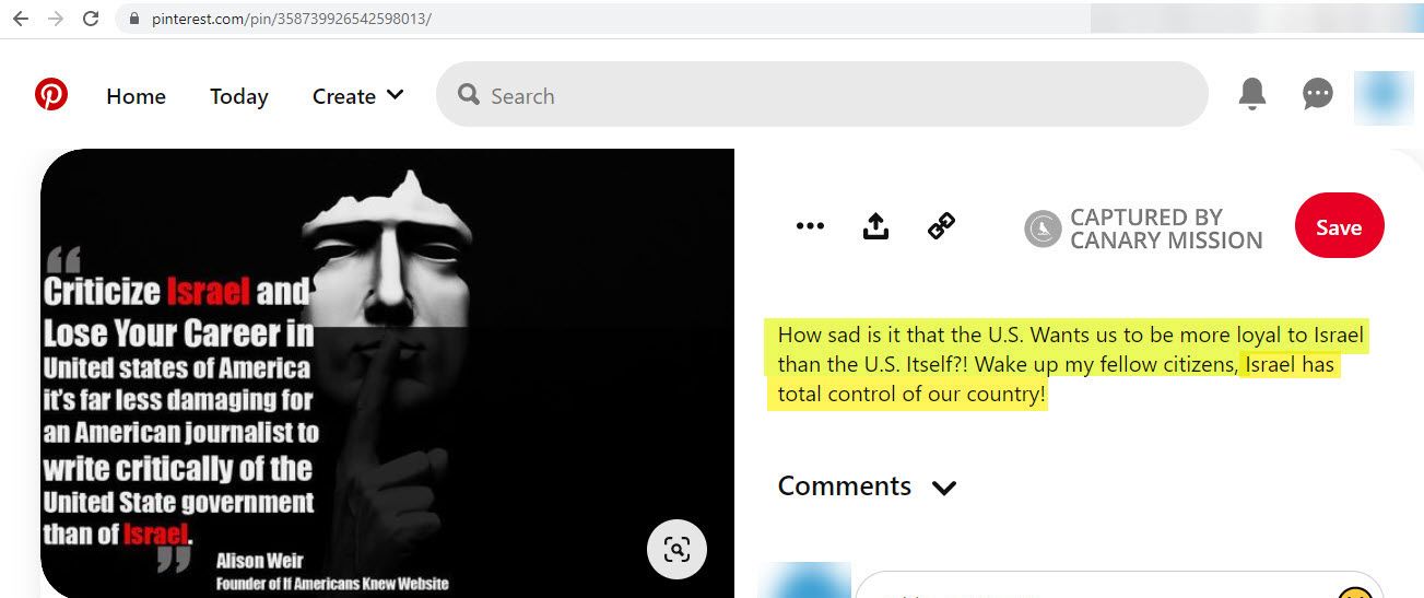 Also as of April 2024, AbuAishah featured on her “Exposing Zionism” Pinterest board an image with a quote by anti-Israel activist Alison Weir. AbuAishah commented on the image: “How sad is it that the U.S. Wants us to be more loyal to Israel than the U.S. Itself?! Wake up my fellow citizens, Israel has total control of our country!”