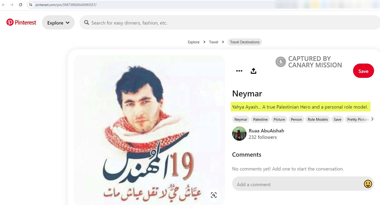 As of April 2024, AbuAishah featured on her“امي فلسطين [My Name is Palestine]” Pinterest board an image of Hamas terrorist Yahya Ayyash. AbuAishah captioned the image: “A true Palestinian Hero and a personal role model.”Ayyash, known as the Engineer of Death, was the chief bomb-maker for Hamas during the mid-1990s. He manufactured the explosives used in numerous suicide bombings that targeted Jewish civilians.