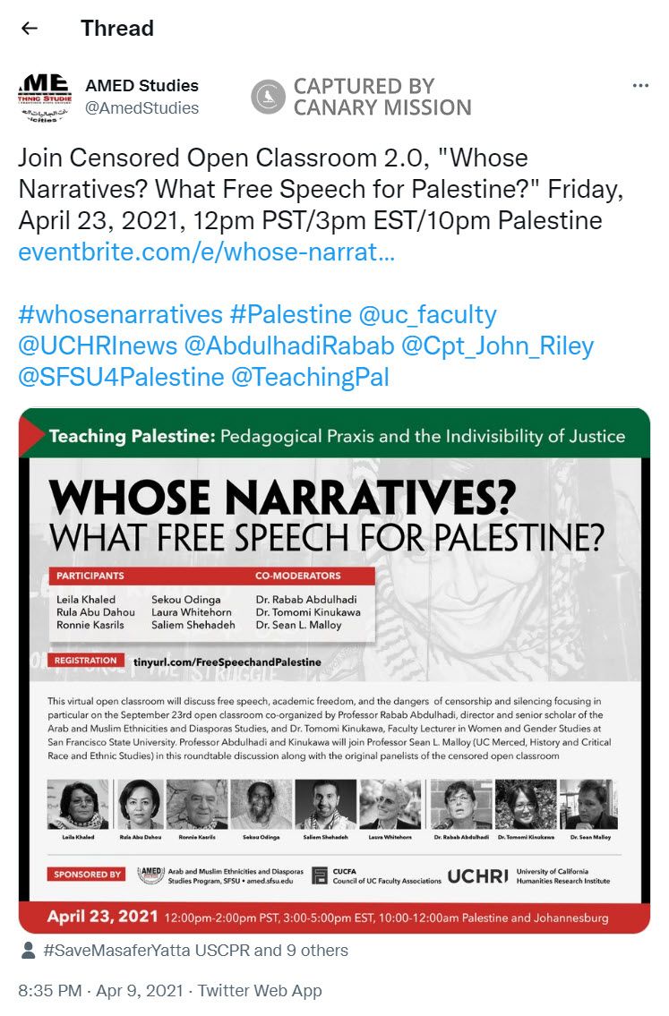 Abdulhadi and SFSU’s Arab and Muslim Ethnicities and Diasporas Studies (AMED) program organized the Khaled event. GUPS promoted the event on social media, including distributing a petition to “support academic freedom on Palestine and against the vilification of Palestinian freedom fighter, Leila Khaled.”