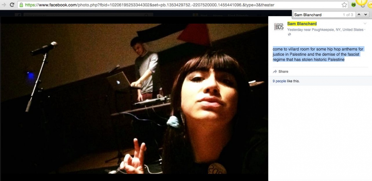 On February 13, 2016, Blanchard publicized a hip-hop performance — and applauded the event’s call for "the demise" of Israel as “the fascist regime that has stolen historic Palestine.”