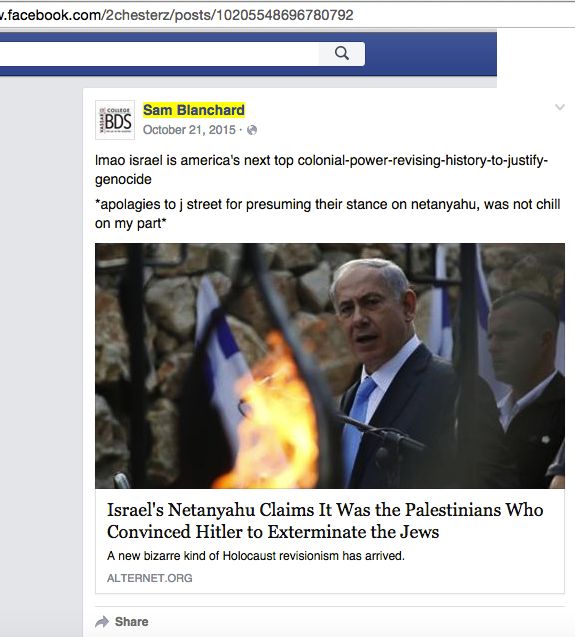 On November 17, 2015 JVP Vassar shared an article on Facebook titled “The way for Americans to take on the Islamic state is to end support for Jewish nationalism.” commenting “We are Jewish, we stand against the oppressive Israeli state, and we will not be ignored.”
