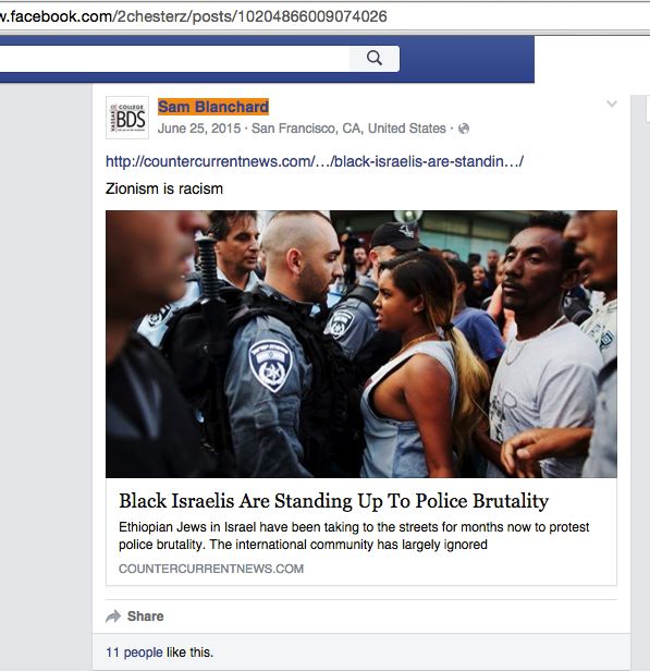 On June 25, 2015, Blanchard posted a slanted article from countercurrent news.com that misrepresented the Israeli police force as universally racist toward Ethiopian Jews. Blanchard announced "Zionism is Racism."