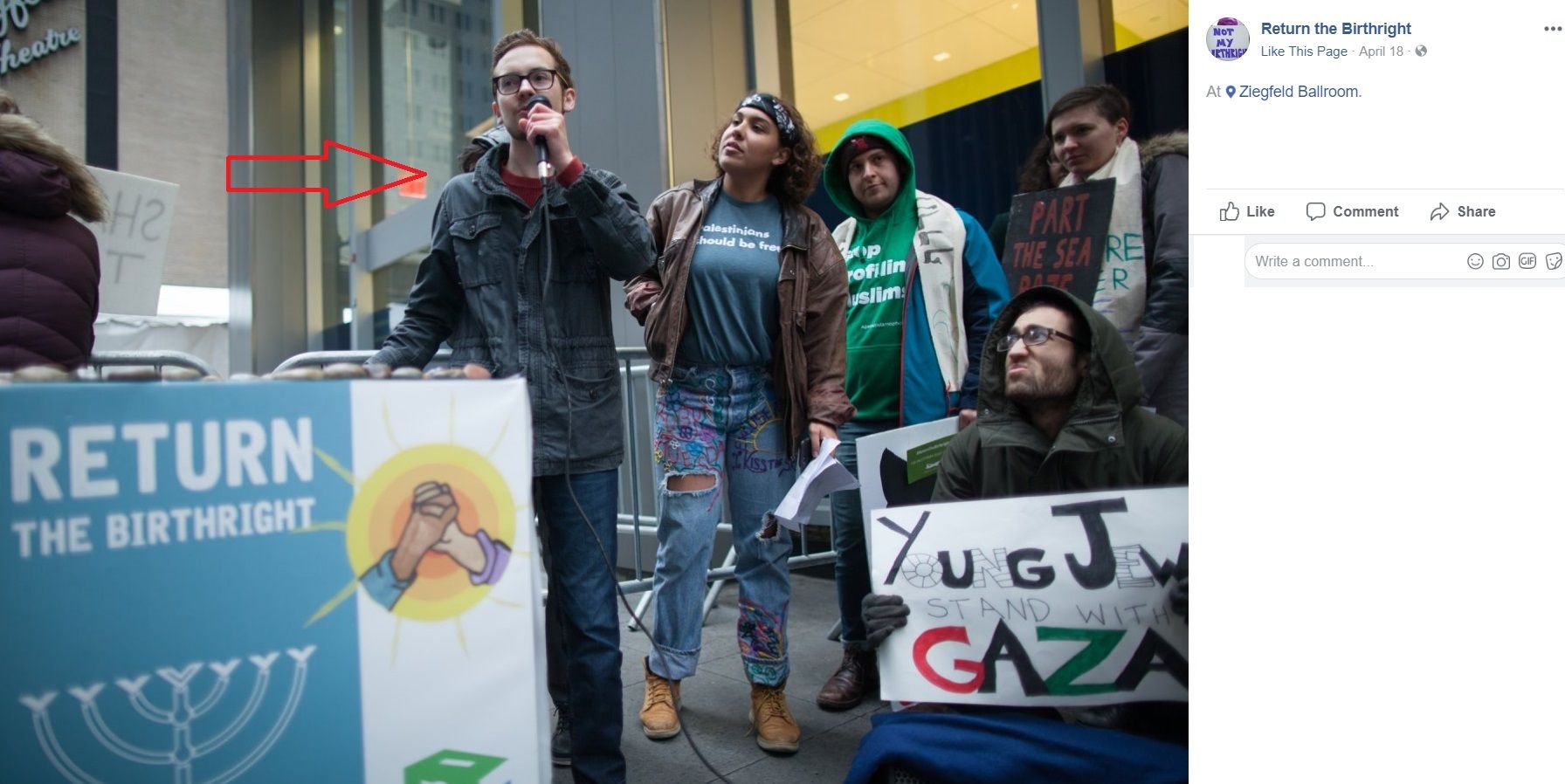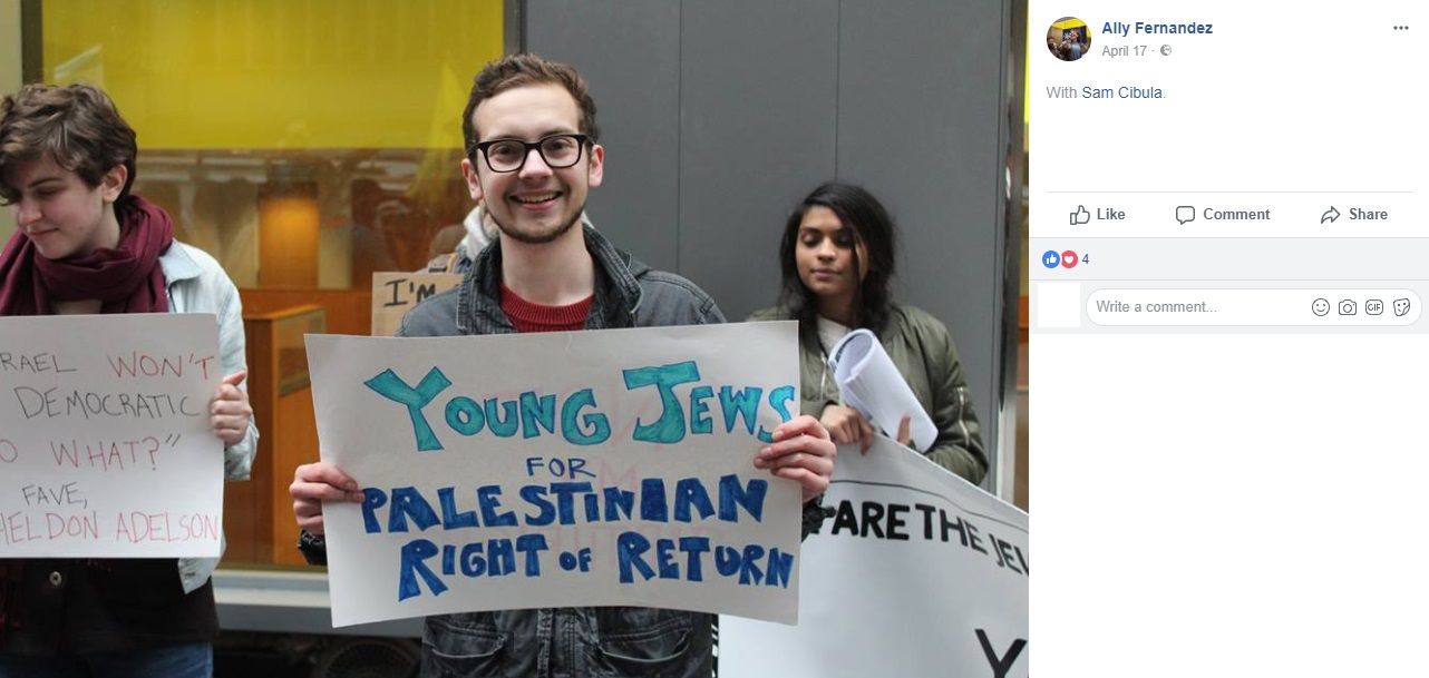 On April 15, 2018, Cibula participated in a Return the Birthright protest outside the Taglit Birthright Gala in New York City. Cibula held a sign that read “Young Jews for Palestinian Right of Return.”He told the crowd [01:11:58]: “I return the Birthright because I believe in a just world, free of colonialism and settler colonialism and all other types of colonialism.”