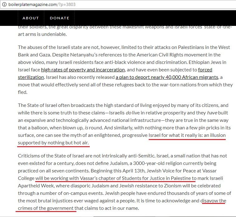 On April 16, 2018, Cibula wrote an article in the online magazine Boilerplate to publicize Israel Apartheid Week (IAW) at Vassar. The article was titled “ISRAEL IS NOT AN INCLUSIVE PARADISE.”In his article, Cibula implied that Israel is an “imperialistic project” and a racist state. He also promoted a libel that Israel forcefully sterilized Ethiopian Jews, a claim that was based on a flawed report by Ha’aretz.