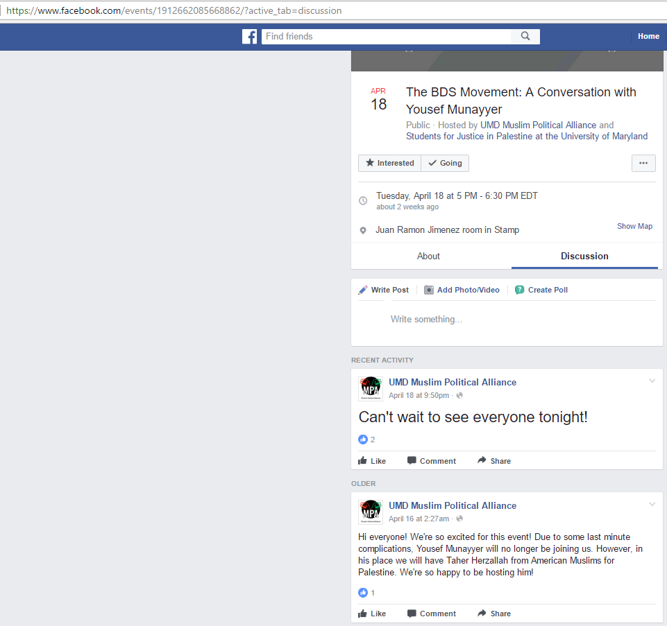 However, on April 16, 2017, UMD MASC wrote on the Facebook event page that Munayyer could not attend and that “in his place we will have Taher Herzallah from American Muslims for Palestine. We're so happy to be hosting him!”