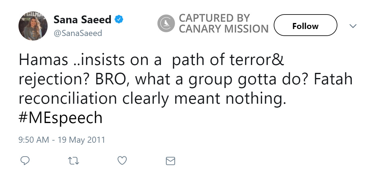 On May 19, 2011, Saeed tweeted: “Hamas ..insists on a path of terror& rejection? BRO, what a group gotta do? Fatah reconciliation clearly meant nothing. #MEspeech.”