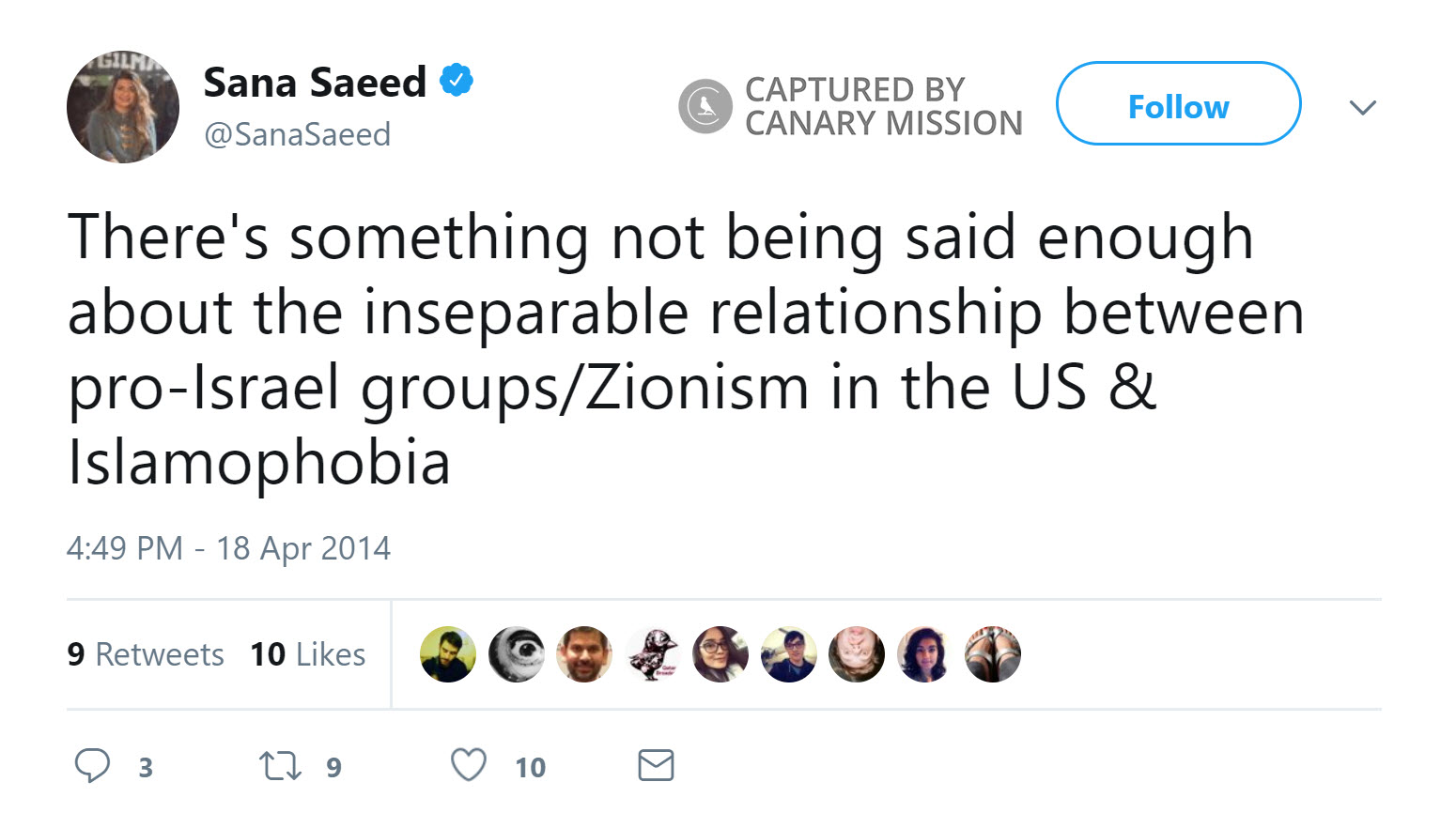 On April 18, 2014, Saeed tweeted: “There's something not being said enough about the inseparable relationship between pro-Israel groups/Zionism in the US & Islamophobia.”