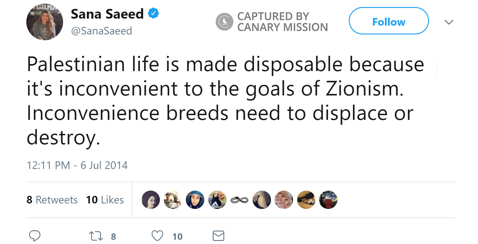 On July 6, 2014, Saeed tweeted: “Palestinian life is made disposable because it's inconvenient to the goals of Zionism. Inconvenience breeds need to displace or destroy.”