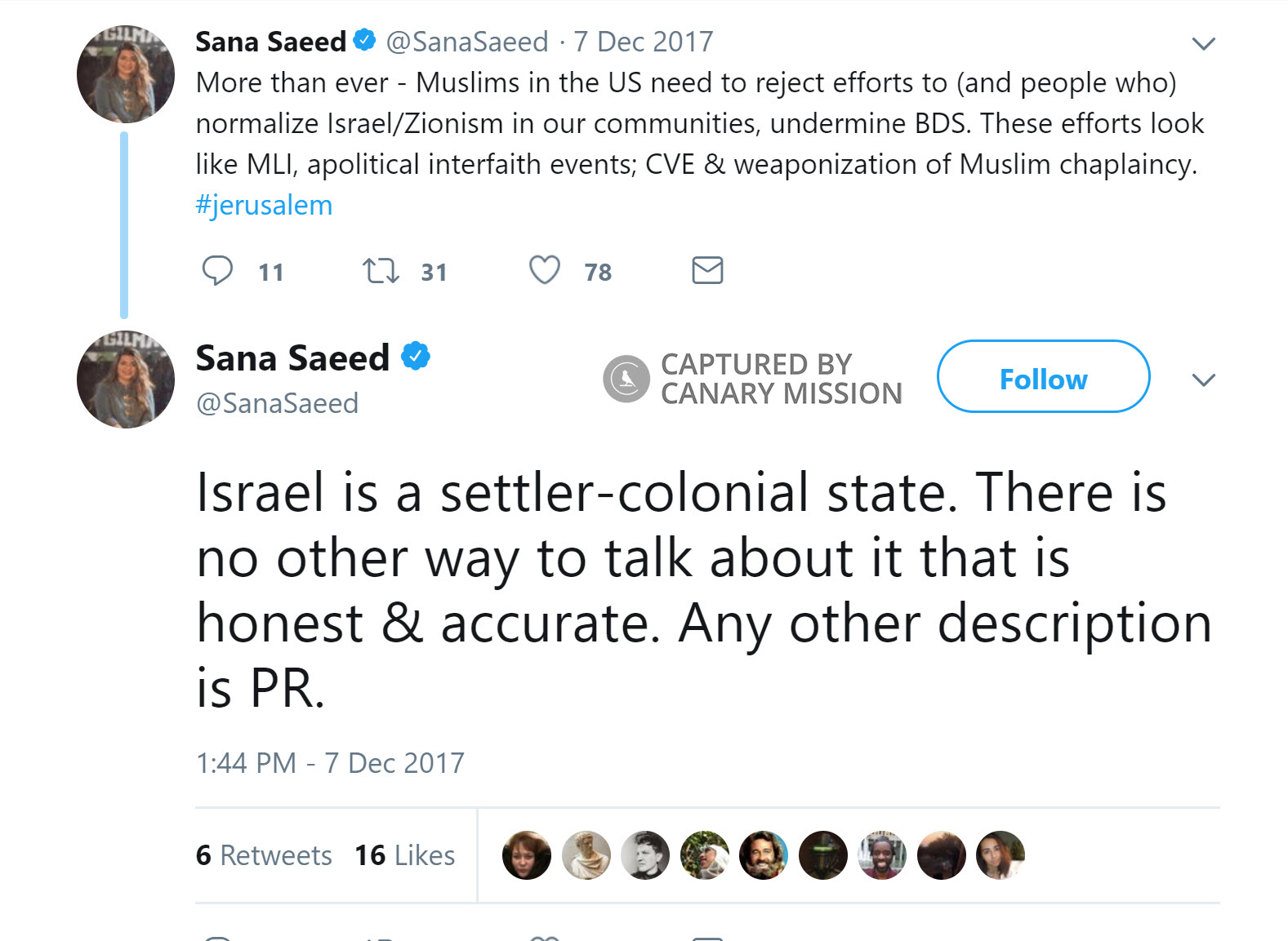 On December 7, 2017, Saeed tweeted: “Israel is a settler-colonial state. There is no other way to talk about it that is honest & accurate. Any other description is PR.”