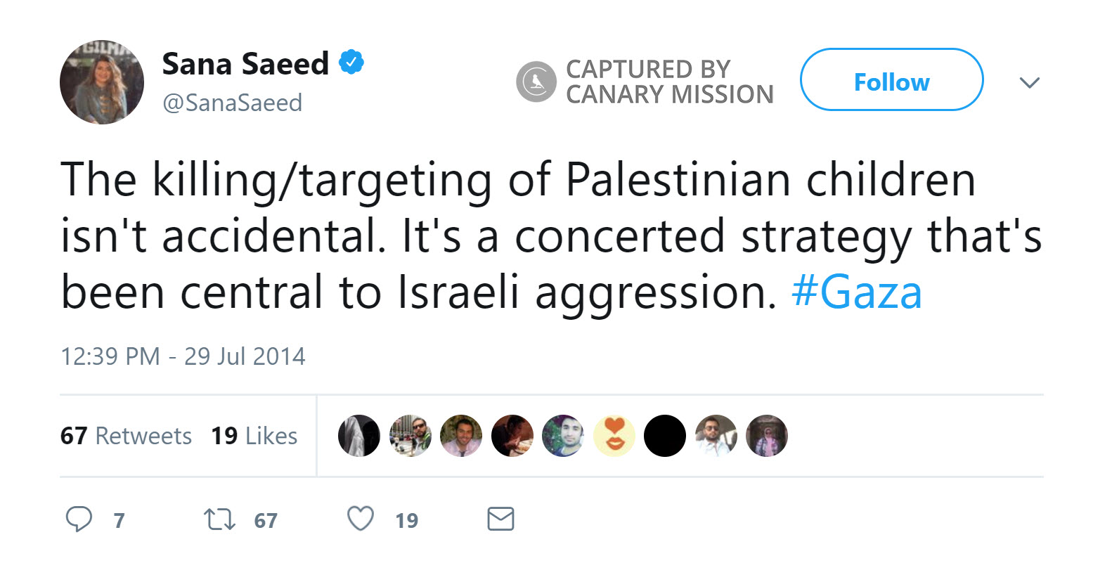 On July 29, 2014, during Israel’s Operation Protective Edge (OPE) in Gaza, Saeed tweeted: “The killing/targeting of Palestinian children isn't accidental. It's a concerted strategy that's been central to Israeli aggression. #Gaza.”