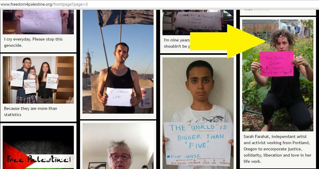 On August 9, 2014, Farahat — during Israel’s Operation Protective Edge against Hamas — produced a pro-BDS Youtube video titled “Gaza” that she uploaded to her website. The video featured an anti-Israel song with lyrics including “Power hungry eyes on the eye in the pyramid…” (2:10) — a reference to classic anti-Semitic conspiracy theories — which is then followed by “Control the news, Muslims and Jews…” (2:16).The video insinuates that United States policies are controlled by Jewish money. The video also shows multiple anti-Israel rallies which featured signs stating “STOP ISRAELI STATE TERROR” (1:43) and chants of “From the River to the Sea, Palestine Will be Free” (6:21).
