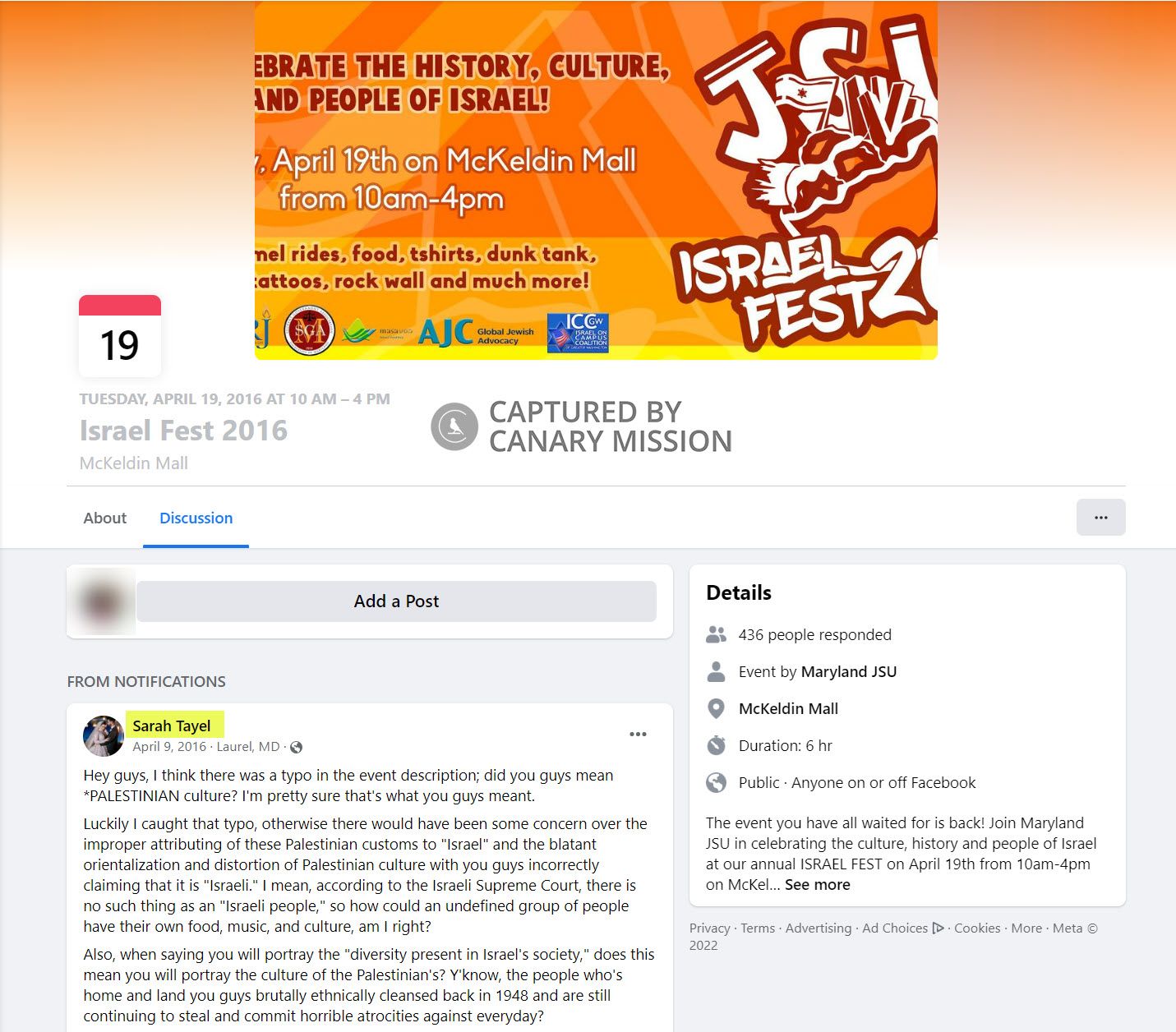Tayel led chants promoting hatred of Israel and then disrupted an Israeli cultural event during an SJP UMD rally and “die-in.”On April 19, 2016, SJP UMD held a rally and “die-in” in protest to the annual UMD Jewish Student Union (Maryland JSU) “Israel Fest” celebration taking place that day on the UMD campus.