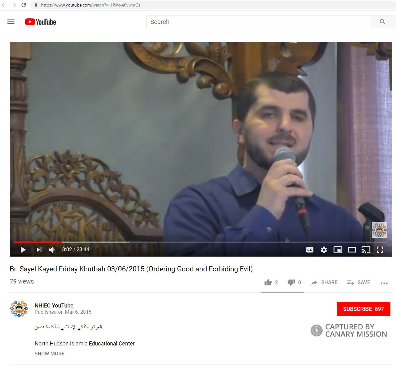 On March 6, 2015, Kayed spoke [00:00:17] at a New Jersey mosque, where he stated [00:03:00] : “The Koran says that the Children of Israel were damned. Why? Because any time they saw evil… they used to not forbid evil. They saw evil, they wouldn’t say anything about it. But our Umma [Muslim nation] is different because if we see evil, we say it.”