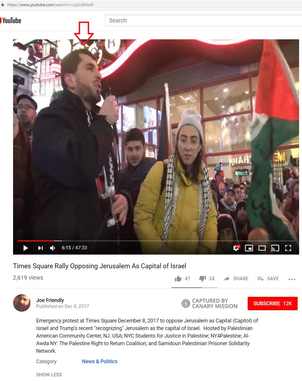 On December 8, 2017, Kayed spoke [00:05:57] at an AMP-NJ rally held in Times Square, which was held to protest the U.S. government’s decision to recognize Jerusalem as Israel’s capital and to move the U.S. embassy from Tel Aviv to Jerusalem.