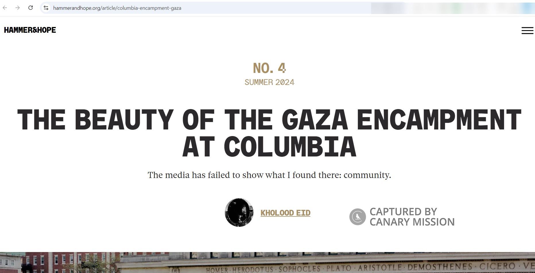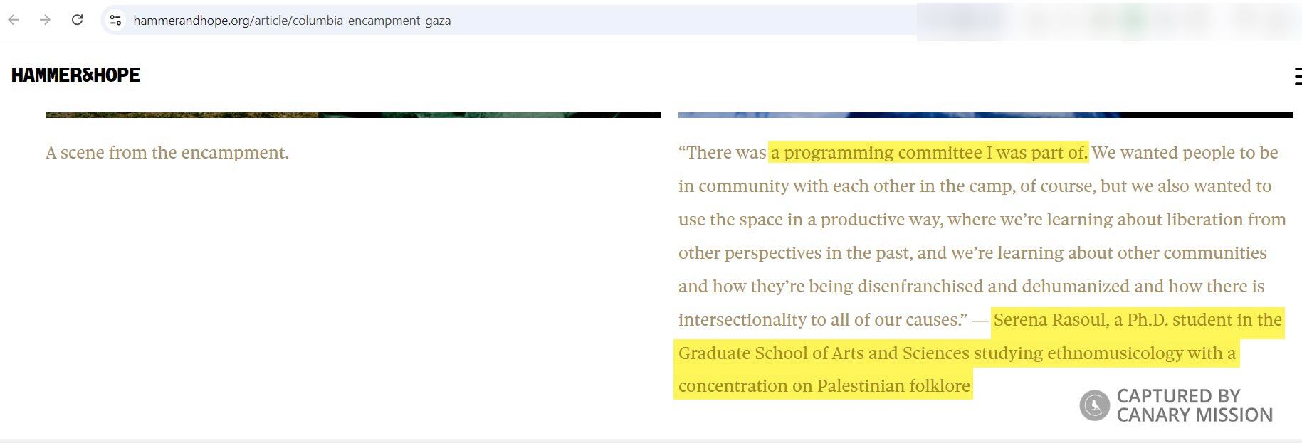 In its Summer 2024 issue, Hammer & Hope, a quarterly online magazine, reported that Rasoul was part of the Columbia encampment programming committee.