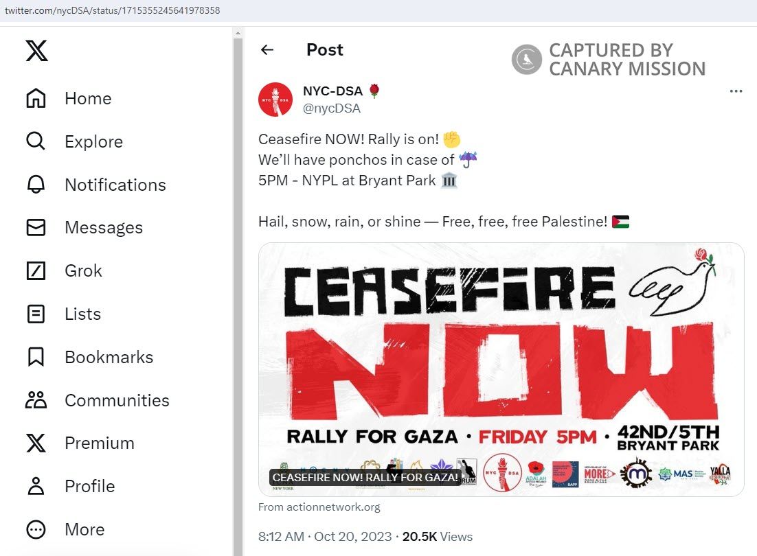 On October 20, 2023, Hanif and two of her staffers were reportedly arrested at an anti-Israel protest titled: “Ceasefire Now Rally for Gaza.” The rally took place in New York City and was organized by the DSA.Hundreds of anti-Israel protesters amassed at the city’s Bryant Park, blocking traffic at the site. Rallygoers held anti-Israel signs, including one that referred to Hamas as “the resistance movement” and read: “NO I DO NOT CONDEMN HAMAS.” Protesters also chanted: “From the river to the sea, Palestine will be free.”