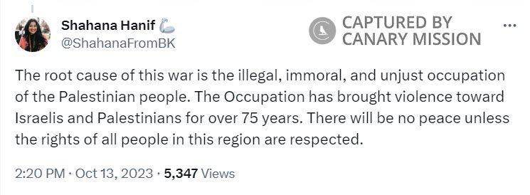 On October 13, 2023, Hanif tweeted: “The root cause of this war is the illegal, immoral, and unjust occupation of the Palestinian people. The Occupation has brought violence toward Israelis and Palestinians for over 75 years…”The modern State of Israel was founded 76 years earlier, in 1948.