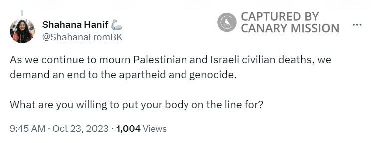 Also on October 23, 2023, Hanif tweeted: “...we demand an end to the apartheid and genocide. What are you willing to put your body on the line for?”