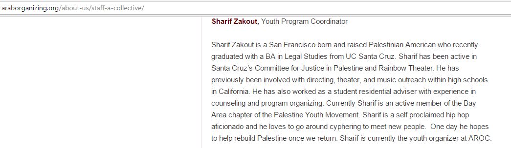 Sharif Zakout is a member of the Bay Area chapter of the Palestine Youth Movement (PYM). PYM states: “Our liberation...will be gained with the path that was written with the blood of our martyrs. We reaffirm that the only path that we are concerned with is the path that explicitly heads towards the liberation of our land and the return of our people to Palestine… All Palestine.”As of September 2019, Zakout was the Lead Organizer of the Arab Resource and Organizing Center (AROC).