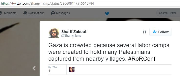 On April 5, 2013, Zakout tweeted — "Gaza is crowded because several labor camps were created to hold many Palestinians captured from nearby villages. #RoRConf"