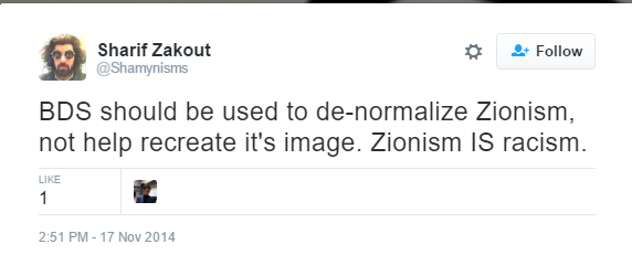 On November 17, 2014, Zakout tweeted — "BDS should be used to de-normalize Zionism, not help recreate it's image. Zionism IS racism".