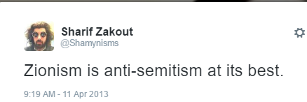 On April 11, 2013, Zakout tweeted — “Zionism is anti-semitism at its best.”On April 6, 2013, Zakout tweeted — “"Israelis have right to self determination just not in the form of a racist state." #RoRConf.”