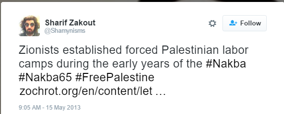 On the same day, Zakout tweeted — “Zionists established forced Palestinian labor camps during the early years of the #Nakba #Nakba65 #FreePalestine http://zochrot.org/en/content/letter-1948-labor-camps …”