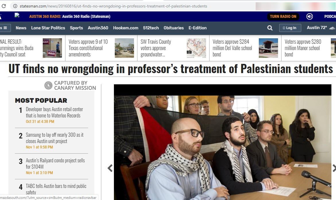 UT’s then-President Gregory L. Fenves was quoted in a local Austin paper as saying that Pedahzur “fostered open, responsible dialogue, often on contentious political issues, including those involving Israel. He is known for working in a constructive and proactive manner with people from across the political spectrum.”