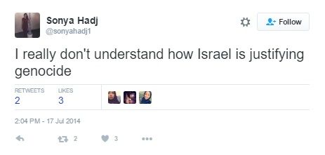 On July 17, 2014, in the middle of Israel’s Operation Protective Edge (OPE), Hadjerioua falsely accused Israel of genocide, tweeting: "I really don't understand how Israel is justifying genocide."