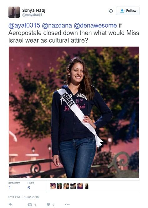 On June 21, 2016, Hadjerioua insinuated that Israel had no culture and history — and thus no connection to Jewish heritage. Hadjerioua asked SJP UTK vice president Stori Nuri — in a Twitter feed discussing the attire of Miss Israel 2016 — "if Aeropostale closed down then what would Miss Israel wear as cultural attire?" Dena Baker, another SJP UTK member answered — “the blood of Palestinian children, probably. It's only fitting.”
