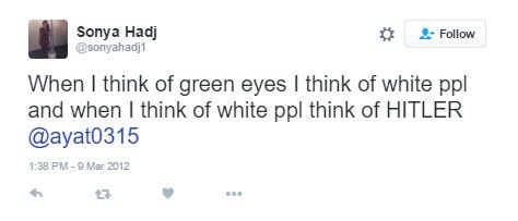 On March 9, 2012, Hadjerioua tweeted— “When I think of green eyes I think of white ppl and when I think of white ppl think of HITLER @ayat0315.”