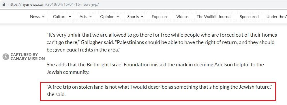 In an April 16, 2018 interview with the Washington Square News about another Return the Birthright protest held that day outside the Taglit Birthright Gala in New York City, Gallagher claimed that it’s “very unfair” for Jews to be allowed to go to Israel for free and that “Palestinians should be able to have the right of return.”