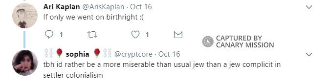 On October 16, 2017, in a Twitter exchange with fellow NYU JVP member Ari Kaplan, Kaplan tweeted: “If only we went on birthright :(“ , to which Gallagher responded: “tbh id rather be a more miserable than usual jew than a jew complicit in settler colonialism.”