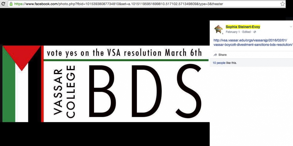 On February 1, 2016, Steinert-Evoy changed her Facebook profile picture to a poster reading Vassar College BDS, Vote Yes on the VSA Resolution March 6th.On February 1, 2016 Jewish Voice for Peace (JVP) at Vassar (JVP Vassar) and SJP Vassar partnered to form the Vassar Boycott, Divestment, Sanctions (VBDS) Coalition, aiming to pass a resolution that would be considered by the Vassar Student Association (VSA) on March 6, 2016.