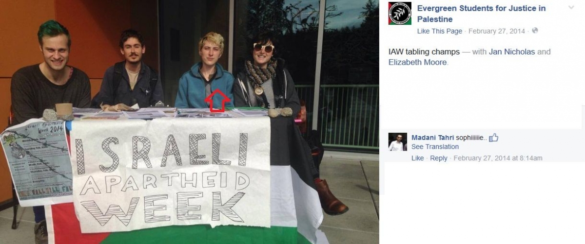 Sophie Pesquidous [Sophie Marie Isabella Yvette Pesquidous] was a member of Students for Justice in Palestine (SJP) at The Evergree State College (TESC) and tabled for the group during its annual Israel Apartheid Week (IAW), in 2014. She was listed on Facebook as one of four SJP members that attended SJP TESC’s Budget Hearing in the Spring of 2014 — where SJP TESC appeared before TESC’s Student Activities board to request funds for its Spring Quarter activities. Pesquidous was also listed as attending SJP TESC’s Winter Quarter interest meeting on January 7, 2015.